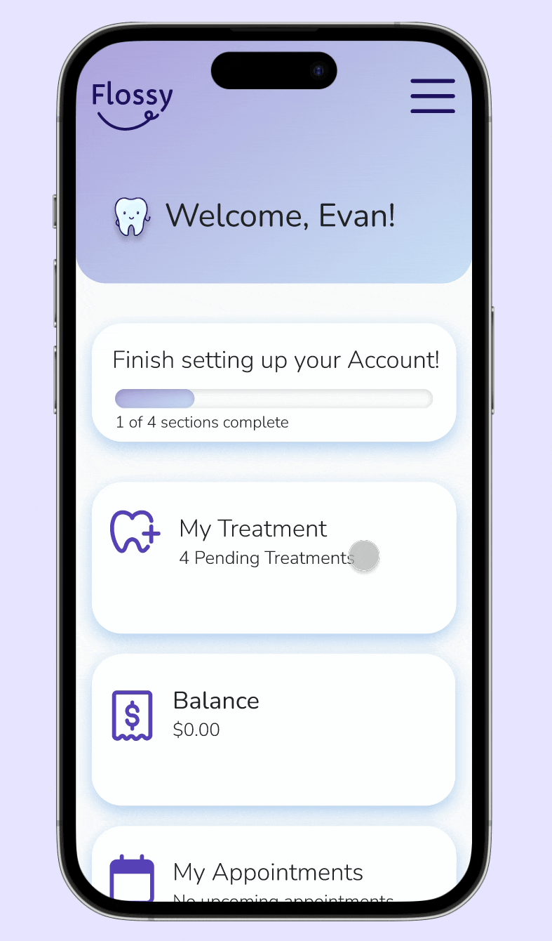 Flossy v.2 introduces a more intuitive and streamlined dashboard, offering users greater freedom while ensuring that the most critical information is prominently displayed. The updated design simplifies the process from selecting payment options to scheduling treatment, making the user journey smoother and more approachable. With enhanced flow and clarity, users can now achieve their goals more efficiently and with less friction.