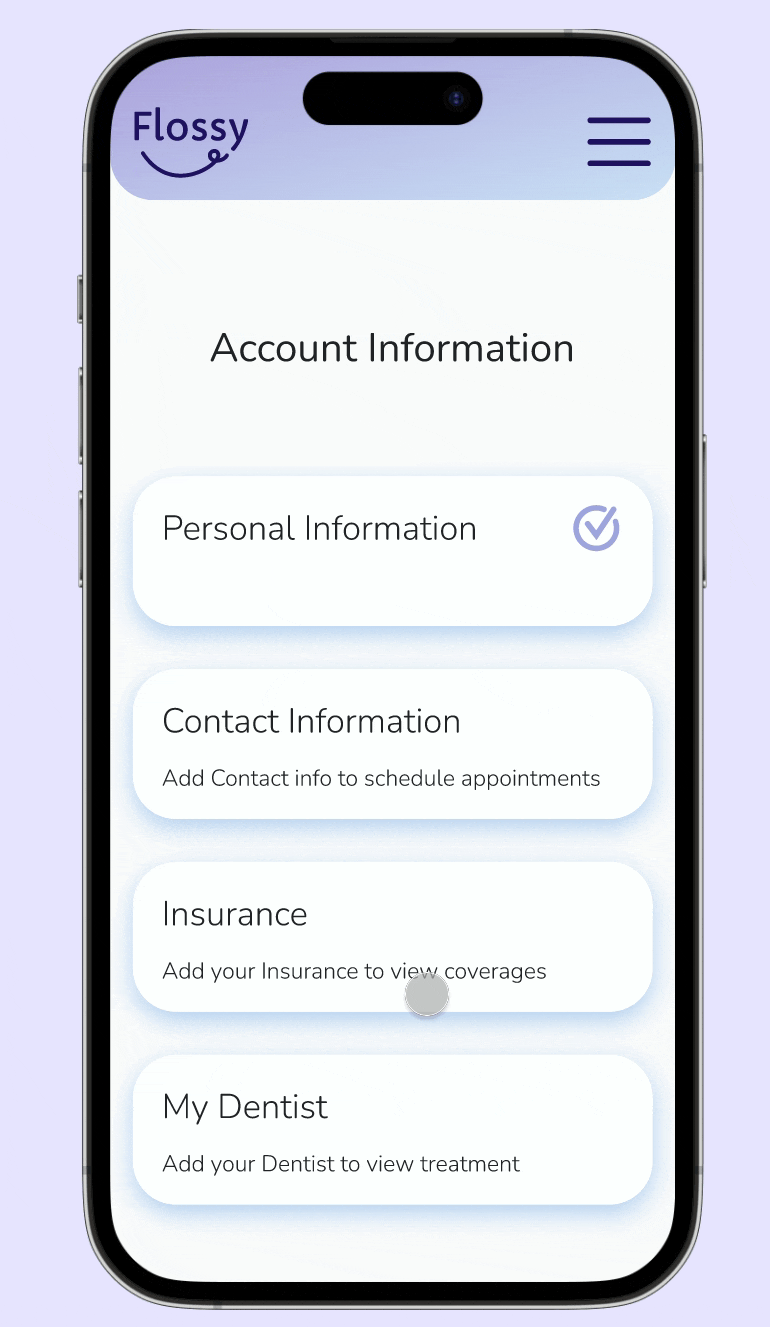 Flossy is a user-centered platform designed to streamline dental patient needs by providing clear and accessible information. Its primary goal is to address patient frustrations, particularly around the lack of transparency in treatment costs and payment options, even before an appointment is scheduled.​​​